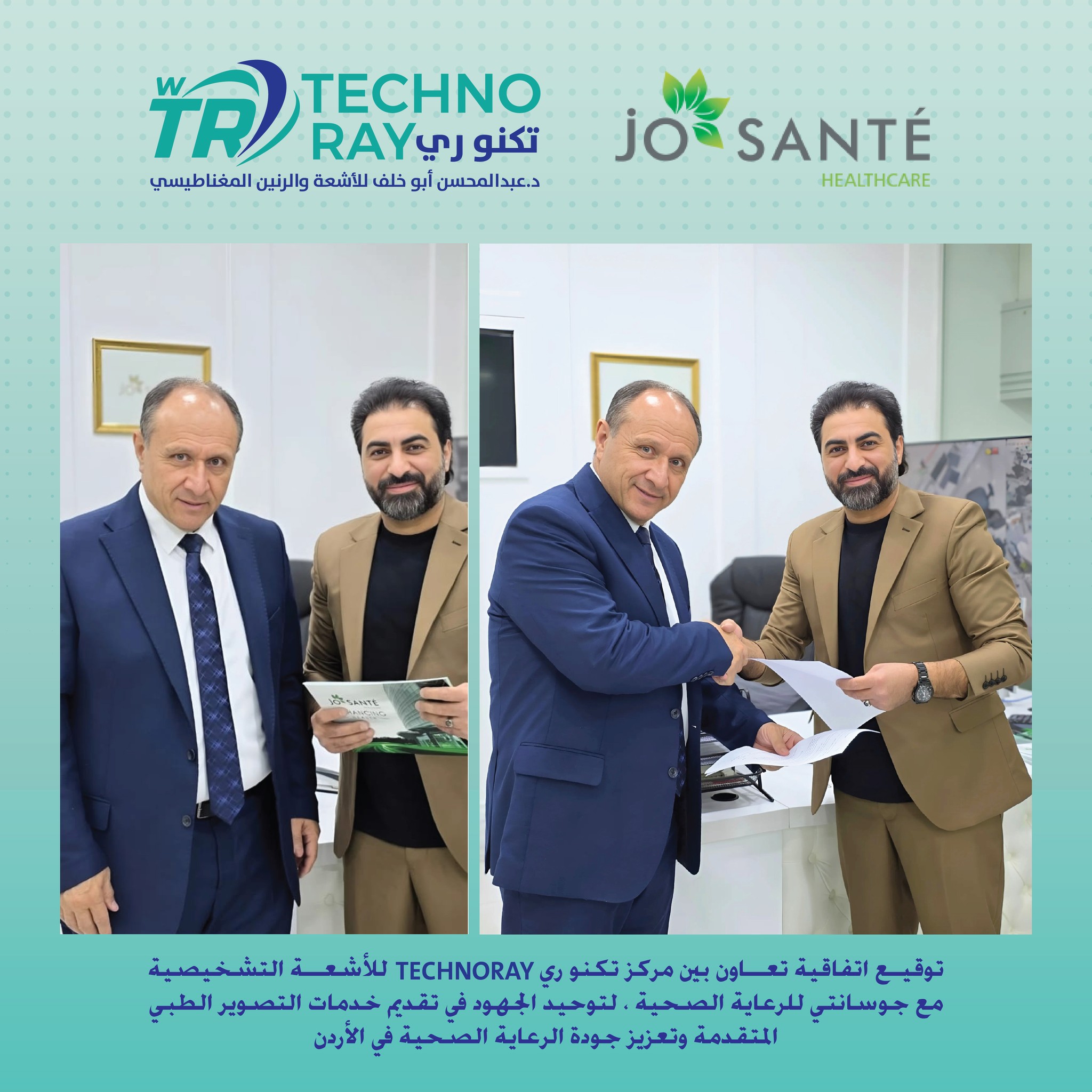 The agreement was signed by Engineer Aref Samawi, Managing Director of Josante Healthcare, and Mr. Mohammad Alomari, General Manager of TechnoRay.